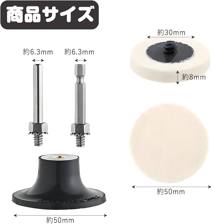 【サイズ仕様】フェルトバフ直径約50mm・厚さ約8mm、ディスクブラケット直径約50mm、軸径約6.35mm・高さ約60mm。電動ドリルやエア工具研磨機などに幅広く対応。