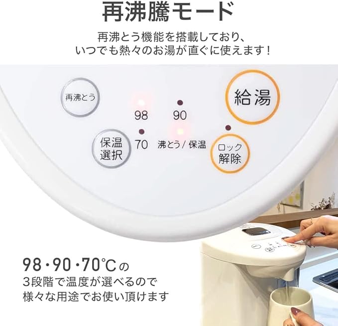 ✅熱湯だけでなく、98℃・90℃・70℃の3段階での湯温に調節できるので幅広くお使い頂ける省エネタイプの電気ポット