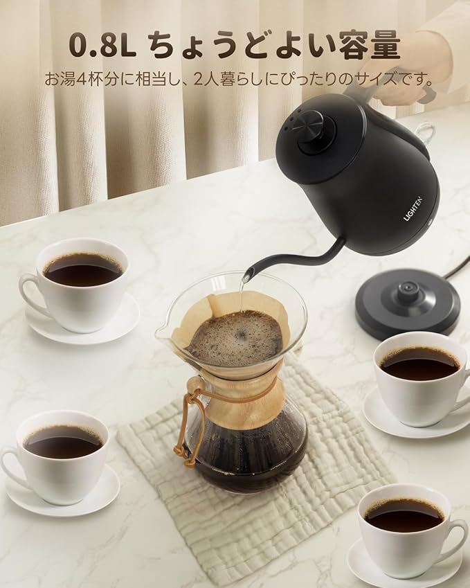 【ワンタッチで急速沸騰・適切な0.8L容量】スイッチひとつで簡単操作。800Wのハイパワーで、忙しい朝でも1杯分のお湯を短時間で沸かせます。0.8リットルの容量は、2〜3人分のドリンクにちょうど良く、一人暮らしや少人数家庭に最適です。