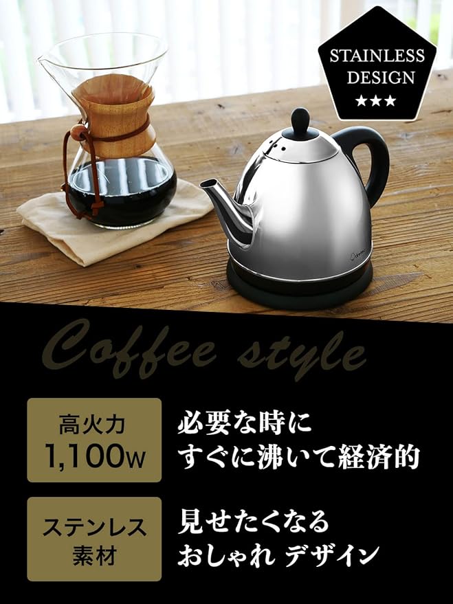 【コスパ最高のステンレスケトル】お手頃価格のステンレスケトルです。安いのに、安全・安心の設計でデザインもおしゃれ!家族で使う方だけでなく、ひとり暮らしの方や職場で使いたい方にもおすすめです。0.8Lですぐ沸くので、来客時にも対応できます。さらに、電気ポットよりも電気代を節約できて、経済的です。