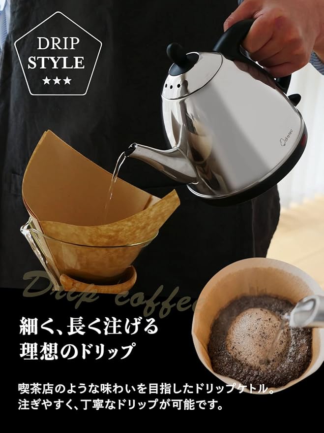 【おしゃれなステンレスケトル】ティーポットのような形の注ぎ口で注ぎやすく、ドリップコーヒーも楽しめます。お湯がこぼれにくいのでストレスなく注ぐことができます。