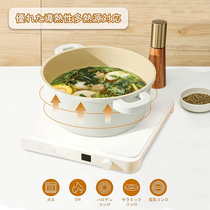 オール熱源対応: ガス火、IH対応、あらゆる熱源に対応しています。底板が厚いため、熱伝導率が高く、食材に均等に火を通し、ムラなく美味しい料理を時短調理できます。
