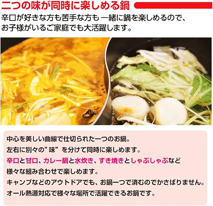 仕切り付きで二つの味が同時に楽しめる便利なお鍋!お手入れ簡単なフッ素加工済みです。辛口好きな方や苦手な方、お子様用のお鍋など異なる味が同時に煮込めるのでみんな一緒に楽しめるのがうれしい!