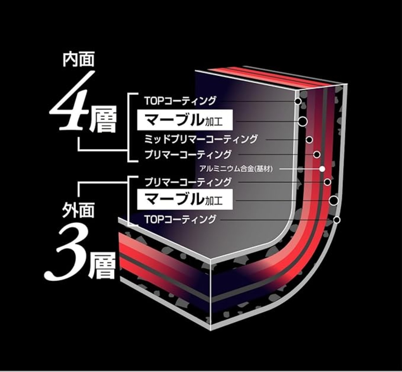 ●内面4層、外面3層、これまでのふっ素加工よりもはるかにこびりつきにくいストロングマーブル