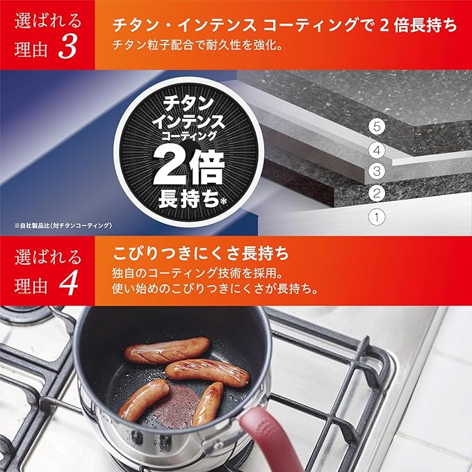 素材・材質:本体/ステンレス鋼 (クロム18%-ニッケル8%)、底/ステンレス鋼 (クロム18%-ニッケル8%)+アルミニウム+ステンレス鋼 (クロム16%)、加工/チタン・インテンス (内面)、取っ手/フェノール樹脂+ステンレス鋼 (クロム18%-ニッケル8%)、ふた/強化ガラス(全面物理強化)、ふたつまみ/フェノール樹脂、生産国:中国