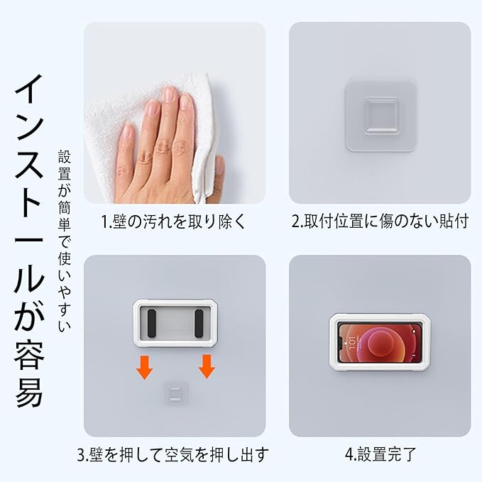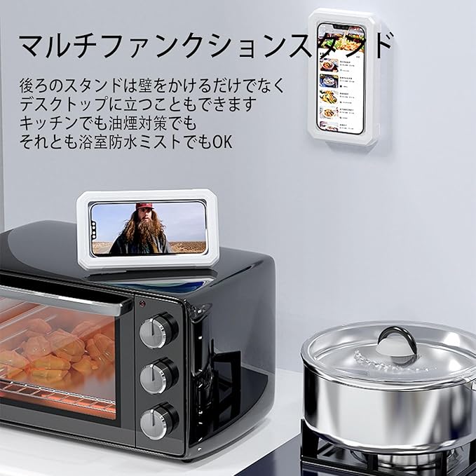 【卓上、壁掛けの2in1仕樣】強力貼り付けシールが付いてる壁用スタンドを滑らかな壁に設置すると、普通の卓上ホルダーから壁掛けスタンドに大変身!ご要望によって組み合わせて、卓上ケースまたは壁掛けケースとして使用可能です。手のひらサイズなので置き場所に困らず、場所の制限がなく、様々な場所にで使用できます。浴室はもちろん、洗面台、キッチン等水付きやすい場所にも手を解放して快適に利用できます。