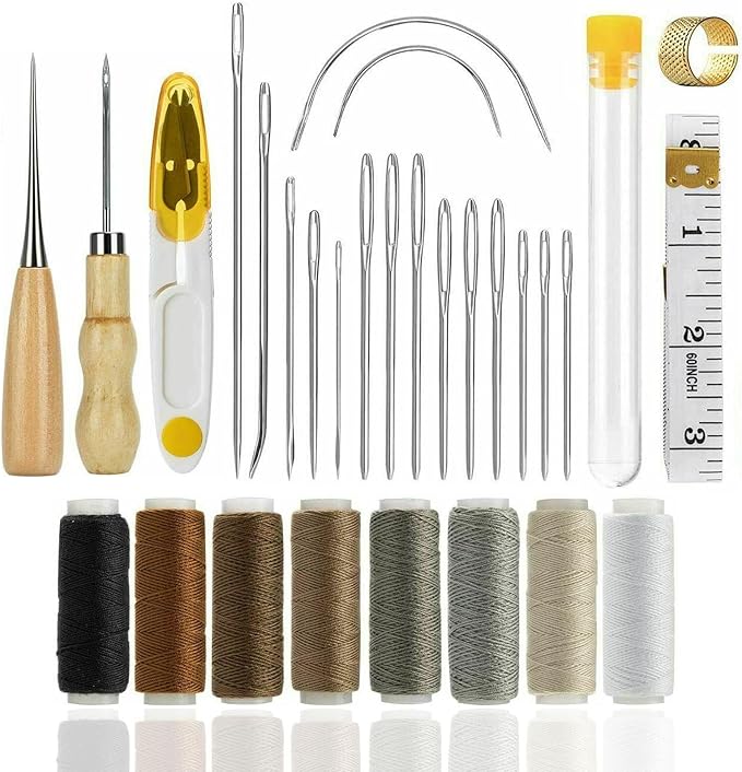 【包装内容】はさみ*1、指貫*1、測定尺*1、千枚通*2、糸*8、裁縫用針*16、針入れも付属。計29点セット。 【ワックス糸】皮革工芸品に必須のワックス糸は、特殊繊維の耐久性が向上し、初心者向けに使用頻度の高い色が統一されており、5色の糸がありますので、それぞれの皮革に合わせて使用してください。 【レザーステッチ】レザー用のツールセットには、さまざまなサイズや形の針先があります。サイズや形状がそれぞれ異なる針は用途や目的に合わせて自由に選ぶことができます。 【使い勝手】この修理キットはプロでも初心者でも簡単に使えます。DIYや工芸品、縫製の趣味がある人にぴったりです。 【幅広く使用可能】皮革だけでなく、皮革、キャンバスなどの材料にも使用できます。DIYに最適:手作り裁縫の革工具を使って、自分の好みに合わせて、おしゃれなオリジナル財布、キーケース、カードホルダー、ジャケットなどを作ります。革細工を始めたいけど何を準備すればいいかわからない初心者におすすめ