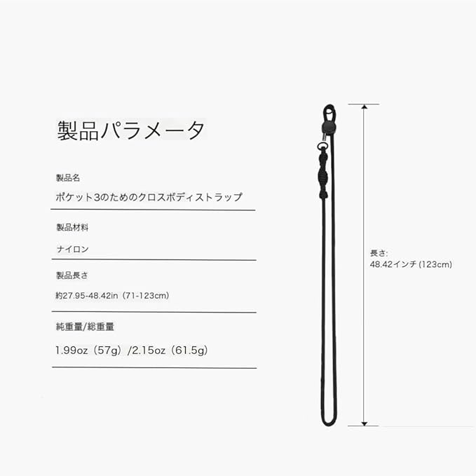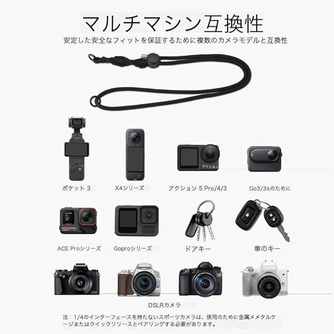 長さ調節可能・幅広い互換性: ストラップの長さは71~123cmの間で自由に調節可能。斜め掛けストラップやネックストラップとしても柔軟に対応。DSLR、DJI Osmo Pocket 3、Action 5/4/3、INSTA360 X4/X3/X2、GO3/GO3S、Goproシリーズ、Ace Proシリーズなど、さまざまなデバイスに対応し、ユーザーの多様なニーズに応えます