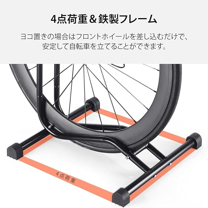 「3タイプの置き方」自転車スタンドを利用すれば、自転車は縦置き、横置き、掛け置き、3通りの方法で置くことができます!縦置きならスペースを有効活用でき、横置きではフロントホイールを差し込むだけで、自転車がしっかりと安定します。さらに、U字フックにチェーンステーを引っ掛ければ、後輪を浮かせてメンテナンススタンドとしても利用可能です。