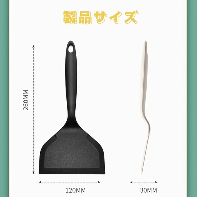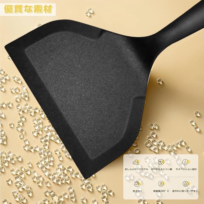 【高品質シリコン製ワイドラ フライ返し】:内側はナイロン、外側は耐久性のあるシリコンで作られ、食材や調理器具を保護。