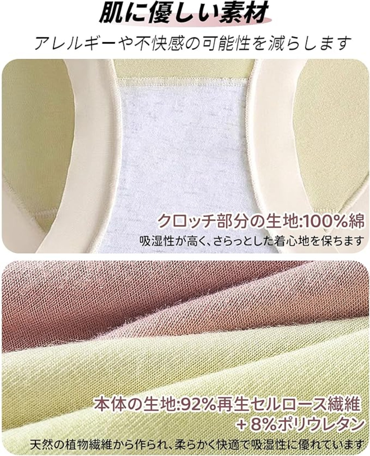素材構成:本体:再生セルロース繊維と92%、スパンデックス8%;クロッチ部:100% 綿