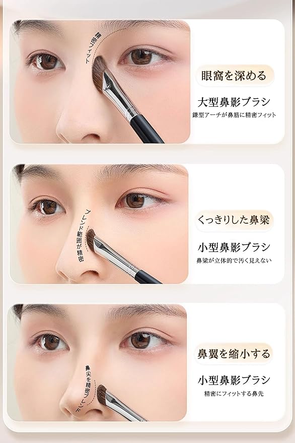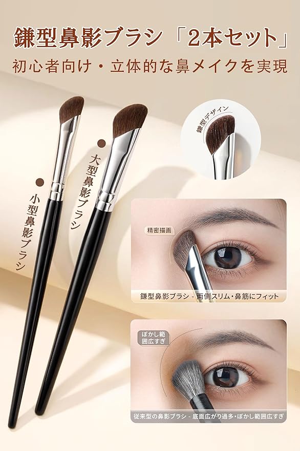 ダブルサイズセット:大型ブラシで鼻全体の立体感を形成し、小型ブラシで目頭や小鼻を精密に修整、多層的なグラデーションメイクが可能