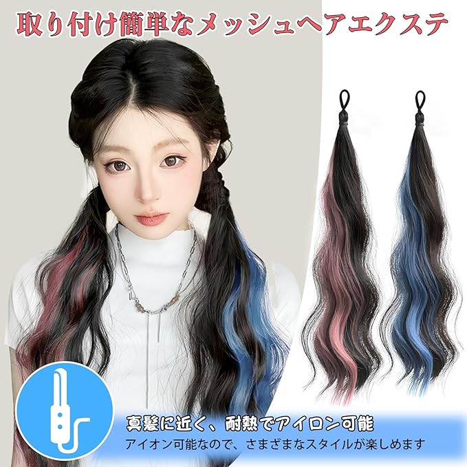 【様々な髪型に対応】ブラウンベースのピンクメッシュで、可愛い系からおしゃれ系まで幅広く使えます。ポニーテール・お団子・編み込みなど、髪のボリュームアップ効果も期待できます