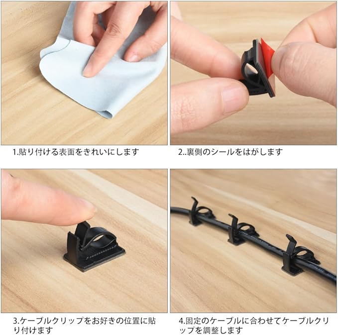 【使い簡単】両面テープのシールを剥がして、固定したい場所に貼り付け、ケーブルをクリップに挟むだけで完了です。釘は不要で、壁を傷つけません