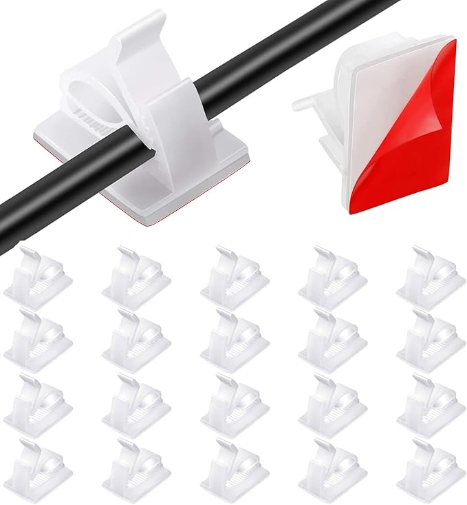 【商品仕様】セット内容:ケーブルホルダー 20個。素材:プラスチック+pvc。サイズ:1.9cm 1.4cm。ご注意:ほこりの多い場所やでこぼこした場所には貼らないでください