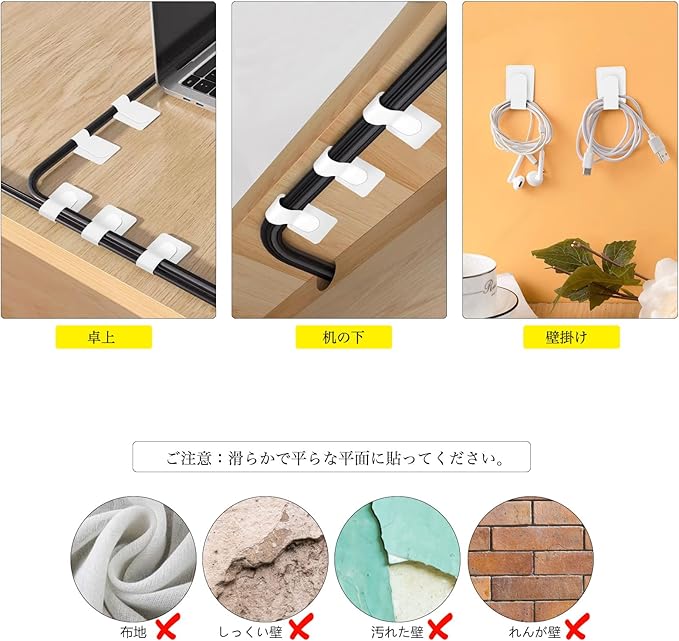 【跡が残らない】このケーブルバンドは環境にやさしい接着剤を採用し、使用後にはがしても跡が残りません。滑らかで平らな机、ガラスなどに貼り付けて収納整理ができます