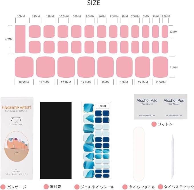 【ツール付き】セット内容:密封の足用ジェルネイルシール1シート32枚、爪やすり1枚、ネイルスティック1本、コットン2枚が入っており、ご自宅でのネイルアートをより便利になります