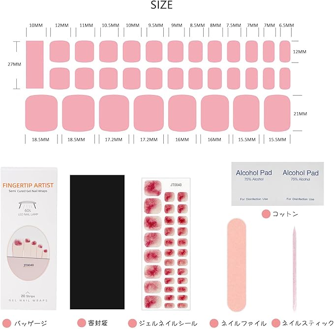 【ツール付き】セット内容:密封の足用ジェルネイルシール1シート32枚、爪やすり1枚、ネイルスティック1本、コットン2枚が入っており、ご自宅でのネイルアートをより便利になります