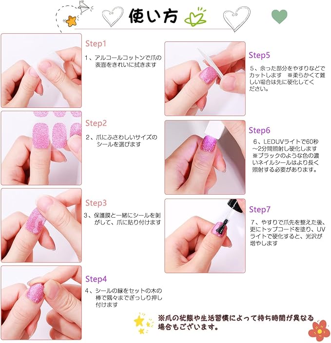 【硬化タイプ】爪のサイズに合ったネイルシールを選び、爪に貼ってからUVライト(別売)で60 s硬化すれば完成です。初心者でもお使いいただけます