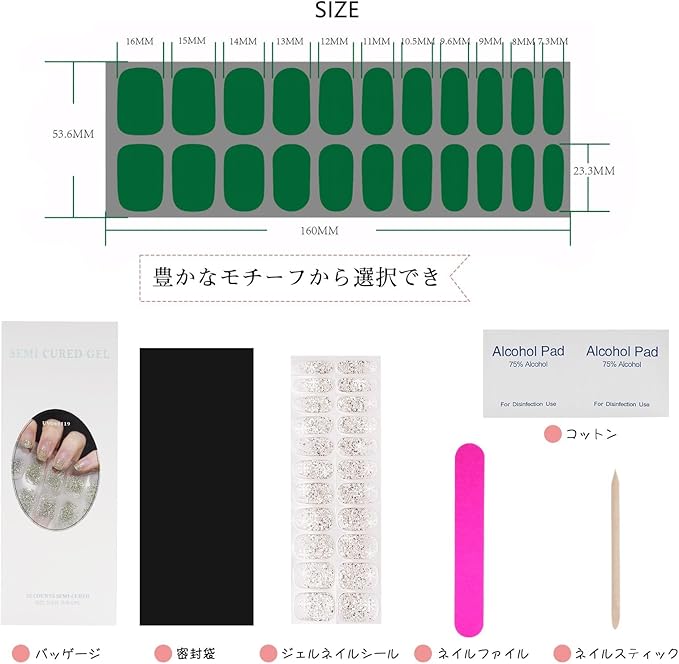 【大容量22枚セット】ジェルネイルシールに22枚入っていて、短い爪でも対応できますし、ツールも付いているので、自宅でのセルフネイルにも最適です