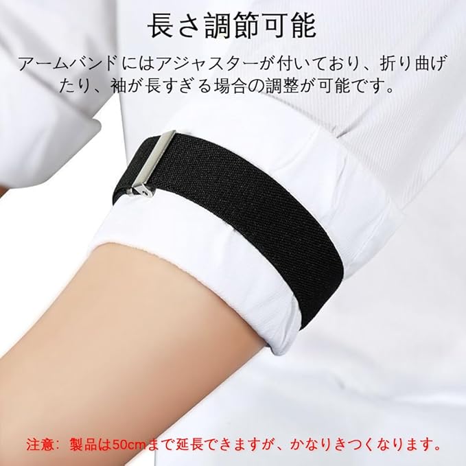 【 長さ調節可能 】: アームバンドにはアジャスターが付いており、折り曲げたり、袖が長すぎる場合の調整が可能です。推奨調整長さは20〜40cmです(実際に伸ばすと最大50cmになりますが、かなりきつくなります)。