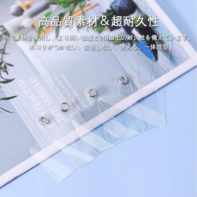 【 製品仕様 】: 透明5個セット 素材:PVC 重さ:3g/枚 サイズ: 【プレート】: 長さ: 55mm 幅: 35mm 厚さ: 0.4mm、[ストリップ]: 長さ: 20mm、幅: 11mm、[リング]: 内径: 5mm。