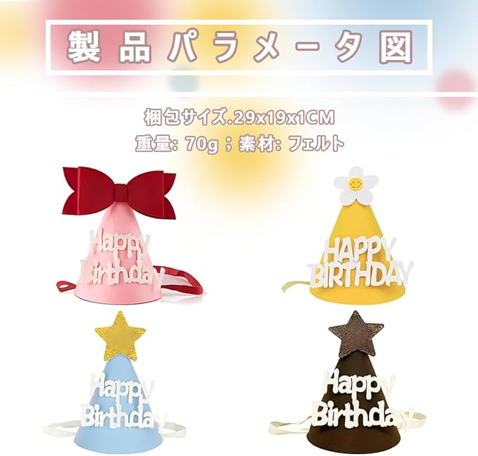 【内容】誕生日パーティーにぴったりな、かわいい三角帽子の4個セットです。お祝いを盛り上げるのに欠かせないアイテムです。あなたの特別な誕生日の瞬間をより楽しく、華やかに演出します。