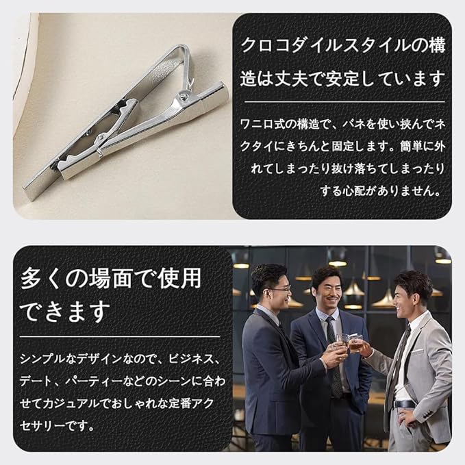 【使いやすい】ワニ口式の構造で、バネを使い挟んでネクタイにきちんと固定します。簡単に外れてしまったり抜け落ちてしまったりする心配がありません。(*お手入れの説明:汗の接触や沖突、外観への影響を避けるため、使用后は拭き取ってから保管してください。)