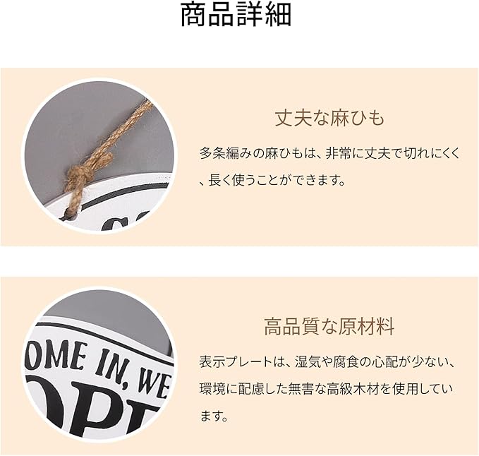 ✨ 【高品質素材】 ナチュラルな木製プレートに麻紐を組み合わせ、お店のドアや壁に優しくフィットします。