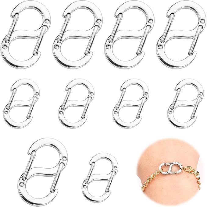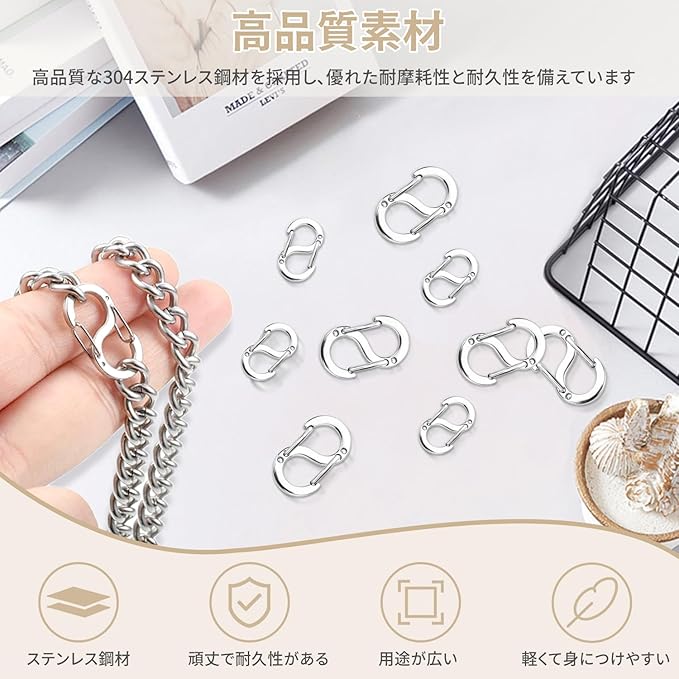 【豊富なサイズバリエーション】 12mmサイズ(約6mm幅)と18mmサイズ(約10mm幅)のS型カラビナが各5個、合計10個のセットです。2種類のサイズが揃っているため、さまざまな小物やアクセサリー制作に柔軟に対応できます。