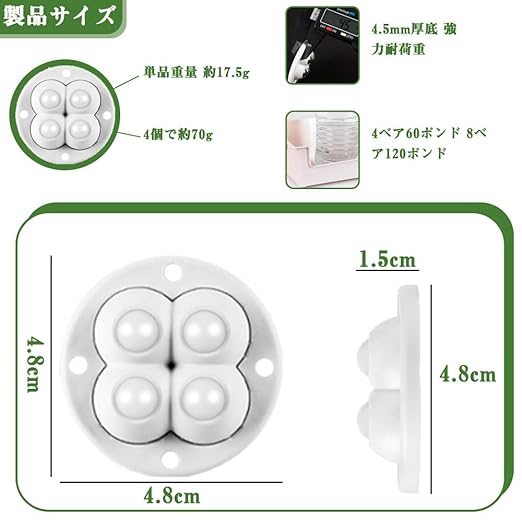 【使用方法】1まず、湿らせた布で、貼り付ける底面の汚れを拭き取り、十分に乾燥させる。2次に、ホイールの裏側の粘着紙を、紙の表面に触れないようにゆっくりとはがします。3次に、底面の四隅に車輪を固定し、車輪に均等に荷重がかかるように位置を合わせます。4最後に、ホイールをしっかりと固定するために、しっかりと押さえます。