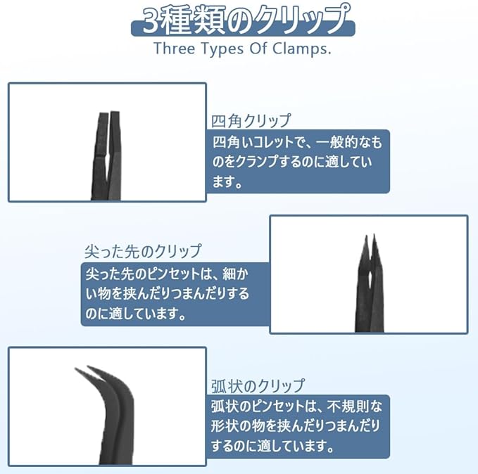 【製品の特徴】 3 種類のクリップ形状で、四角・尖った先・弧状、用途別に使い分け可能。 PP プラスチック素材で、軽量かつ耐久性に優れ、無毒・無害・無臭。 尾部が密着し、髪の毛を挟んで取るなど、細かい作業もしっかり対応。