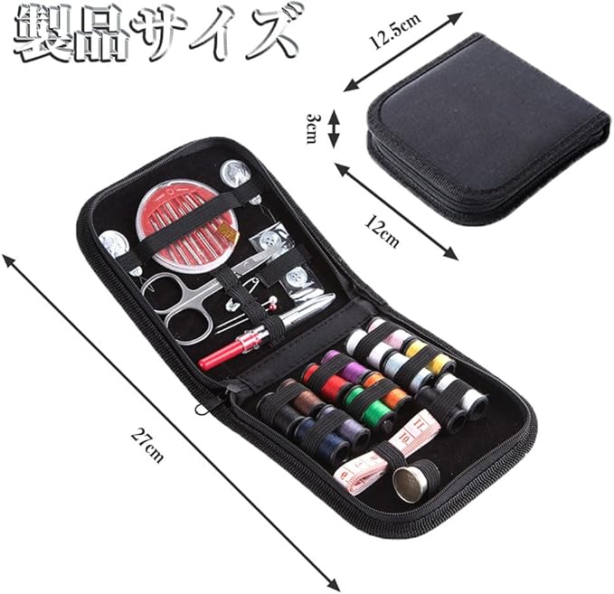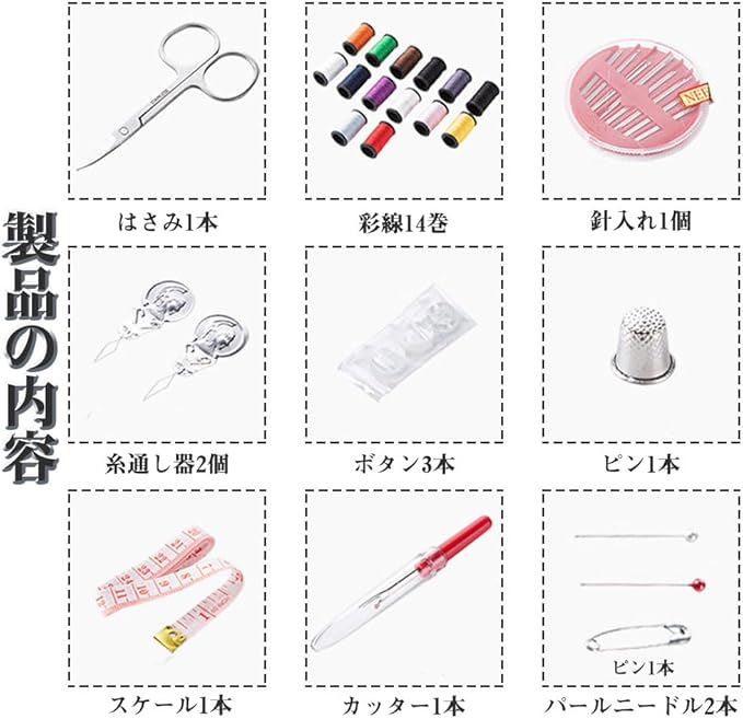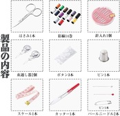【裁縫セット内容】収納袋*1、縫い糸*14色(色はランダム)、裁縫針カバー*1(16本の裁縫針)、ピン*1、予備ボタン*3、真珠針*2、糸通し器*2、スケール*1、糸切り器*1、はさみ*1、トップ針*1の10種類の工具を収納し、ほとんどすべての裁縫作業を行うことができる。