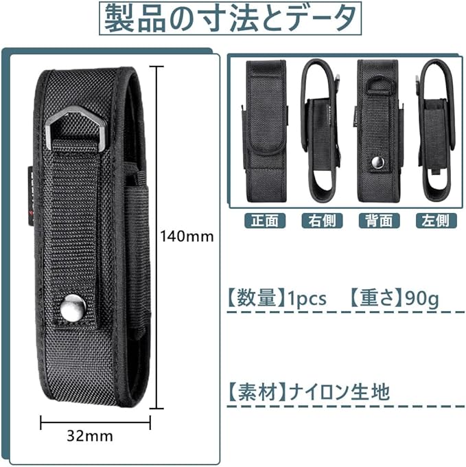 【商品サイズ】 全長140mm、幅32mm 、重量は90gです。コンパクトで、腰に取り付けても邪魔になりません。