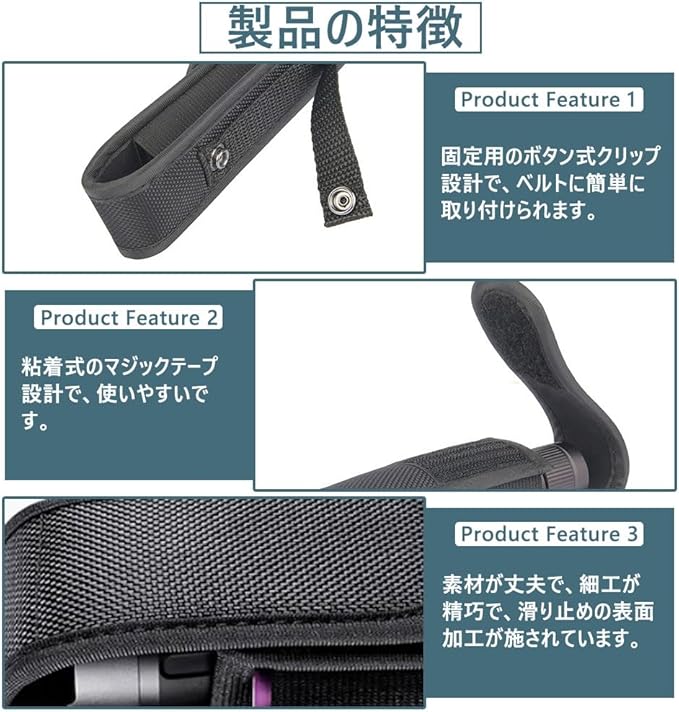 【製品の特徴】 ボタン式クリップで腰ベルトに簡単に取り付けできます。 粘着式のマジックテープが使いやすく、伸縮布地で収納物の大きさに合わせられます。 表面には滑り止め加工が施されています。