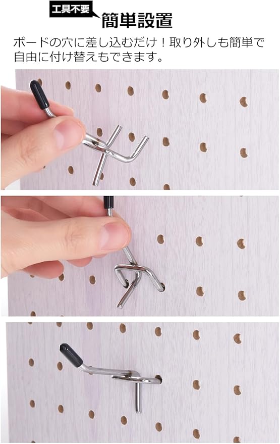 【取り付け方法】取り付け方法はパンチングボードの穴に合わせてひっかけるだけ。どなたでもすぐにご使用いただけます。