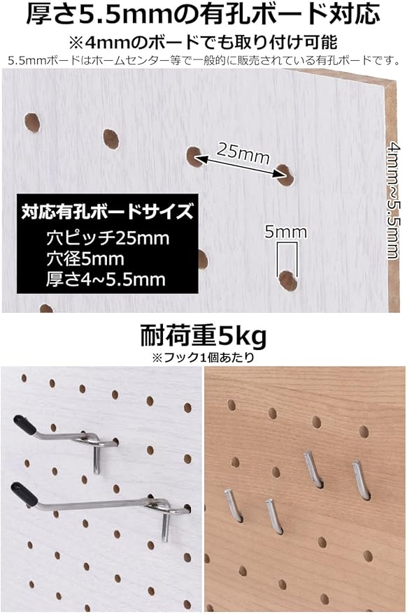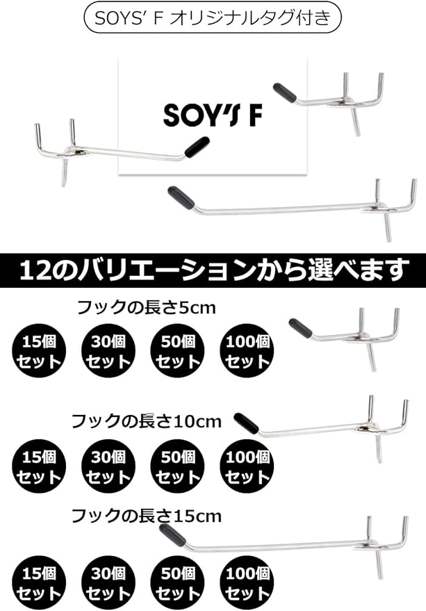【ボードの厚さ5.5㎜対応版】当社のパンチングボード用フックはホームセンター等で一般的に販売されている厚さ5.5㎜、ピッチ25㎜の有孔ボードに対応したフックになります。厚さ4㎜のボードにも取り付け可能。必要なサイズ・個数が選べるように、フックの長さは5㎝・10㎝・15㎝の3サイズ、個数は15個セット・30個セット・50個セット・100個セットの4種類の計12バリエーションをご用意いたしました。