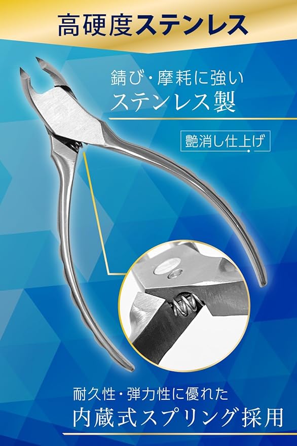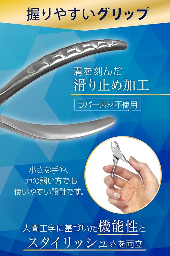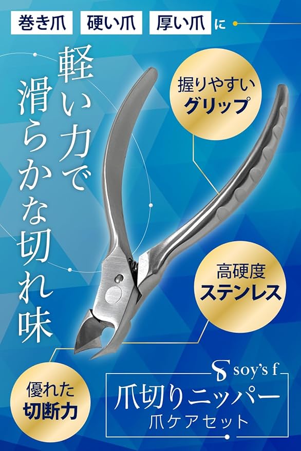 【ニッパータイプの爪切り】「硬い爪」や「厚い爪」・「巻き爪」に適した爪切りとなり、比較的に硬く厚みのある「足の爪」に使用されます。工具のニッパーのような構造で、てこの力を利用し通常の爪切りより軽い力で切りやすくなるよう設計されております。通常の爪切りでは切りにくい爪の端にも届き、細かく切ることができます。