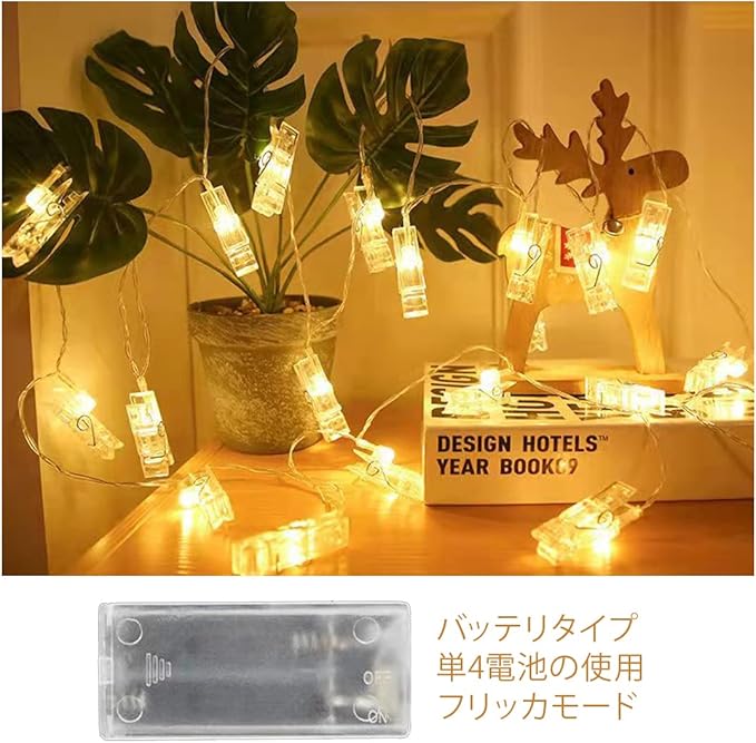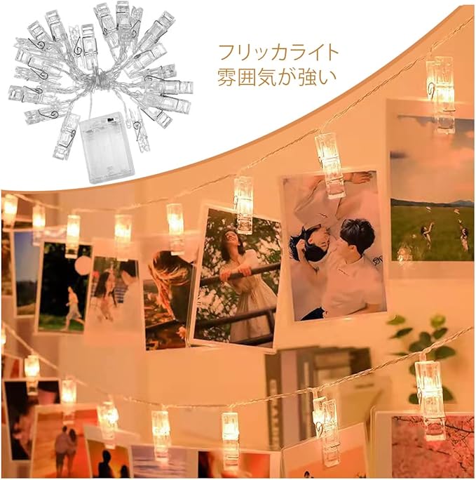 【商品仕様】クリップ合計20個 、全長3M 、ウォームホワイト、電源:単3形(AA)電池*3(別売)。装飾ランプで使用され、大切な写真ををオフィスや自宅に飾るしロマンチック雰囲気を作成できます。