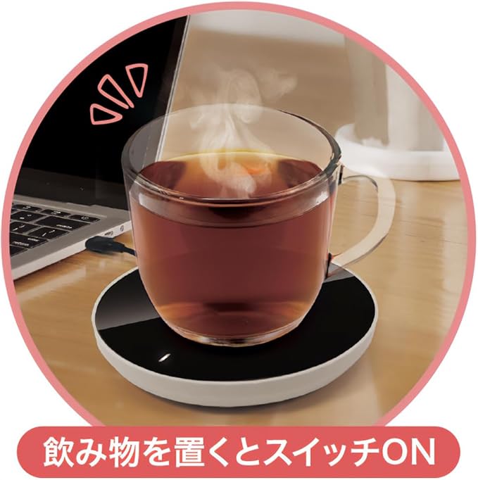 簡単操作&自動ON/OFF 温かい飲み物を入れたカップを置くだけで、自動でスイッチが入りドリンクを長時間保温。オフィスでも自宅でも、いつでもあたたかい飲み物を楽しめる便利なアイテムです。