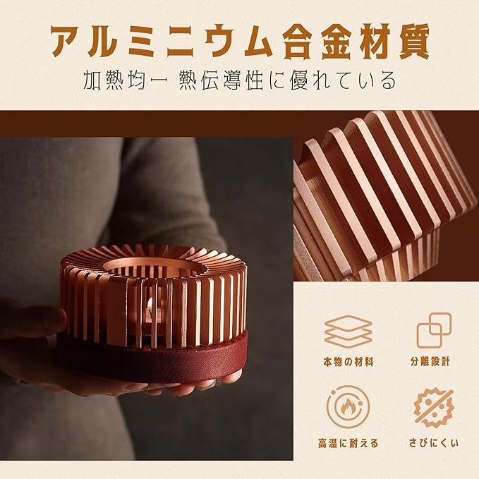 【安心の原木台座】このティーウォーマーセットには荷重性と安定性に優れた天然木の台座が付属。底部も加熱可能で、付属のステンレス製キャンドル皿が台座を焼け焦がしから守ります。