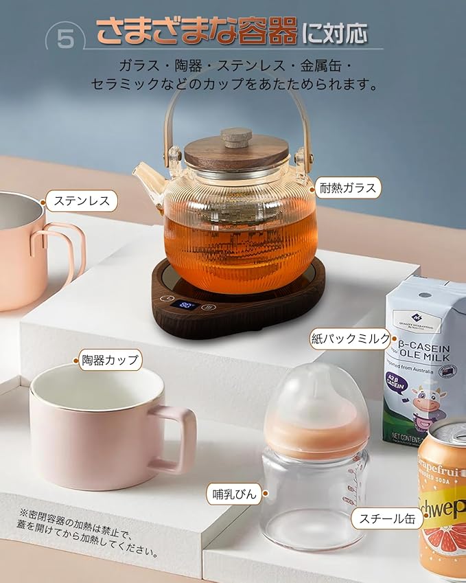 ☕【さまざまな容器に対応】さまざまなカップに対応している、使い勝手のよいカップウォーマーです。ガラス・陶器・ステンレス・金属缶・セラミックなどのカップをあたためられます。ドリンクを陶器のマグカップに移さなくても使えるためとても便利です。また、デザインもシンプルなので、自宅だけでなくオフィスで使うのもおすすめです。