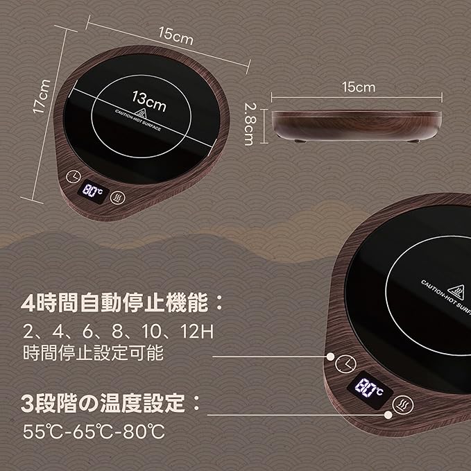 「2~12時間タイミング機能・コンセント給電タイプ 素早く温める」タイミング機能:2、4、6、8、10、12時間タイマーを選択できます。 安全性を確保するため、デフォルトでは保温コースターは4時間使用すると自動的にオフになります。ご注意ください:カップは撮影用で、含まれていません。マグカップウォーマーの定格消費電力:36W。