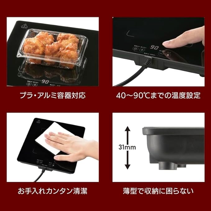 ●プラスチック容器・アルミ容器・紙容器・陶器もそのまま置ける ●保温専用 ●40~90℃まで10℃刻みで温度設定が可能 ●ガラスプレートでお手入れカンタン ●31mmの薄型で収納に困らない ●本体カラーはブラック