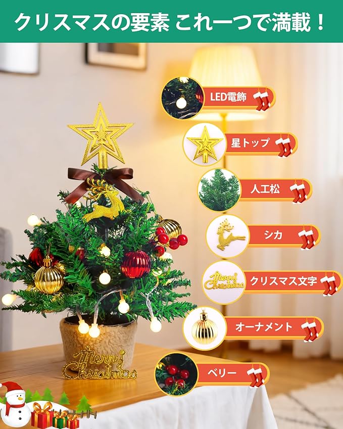 【幅広いシーンで活躍!】この卓上 クリスマスツリーは約32cm のコンパクトサイズで、リビング・子供部屋などの家庭内、オフィスやカフェなどの公共・商業空間にも配置可能です。北欧風~和風まで多様なインテリアに無違和感に溶け込み、場所を選ばず手軽にクリスマスの雰囲気を演出できるクリスマスの貴重な宝物です。
