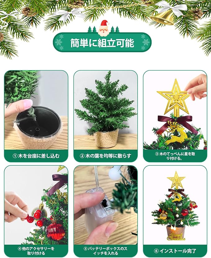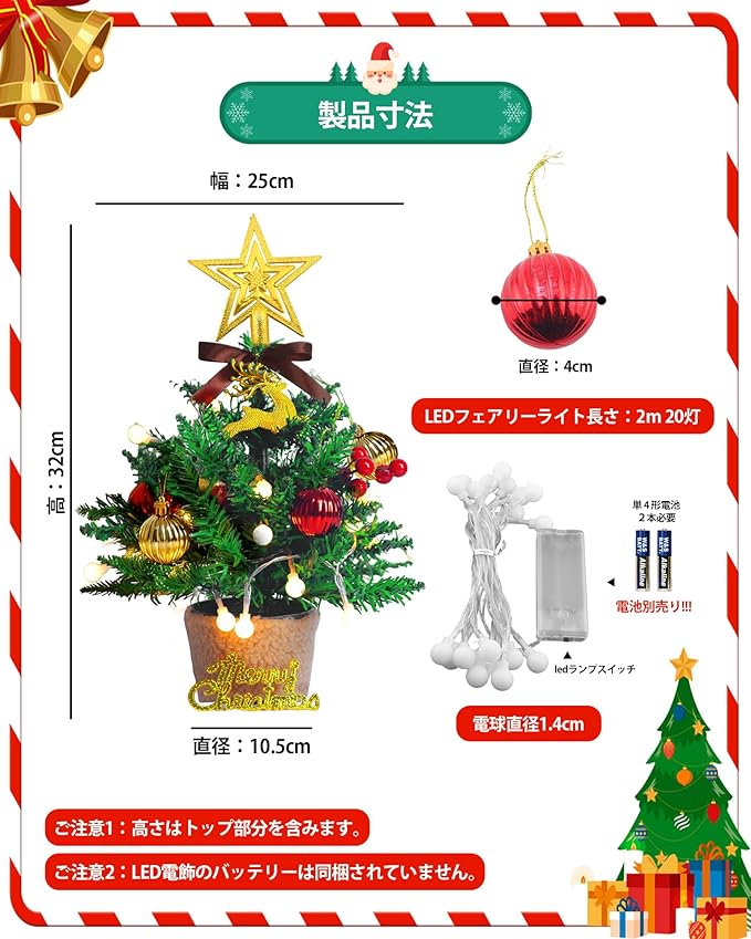 【ミニクリスマスツリーの製品仕様】ツリーの高さ:約32cm、ミニツリーの本体重量:約190グラム、材質:PVC。パッケージ内容:卓上クリスマスツリー 1、LEDフェアリーライト 1(2m 20灯 電池式)、クリスマスギフトカード 1、オーナメント 4、星トップ 1、リボン 1、christmasの文字 1、飾りシカ 1、赤いフルーツベリーストリング 2。