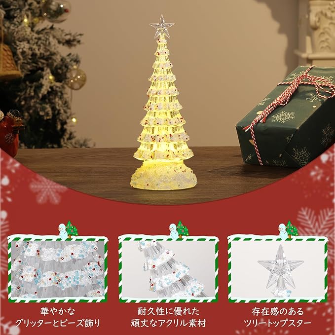 「上質な素材採用したコンパクトな仕様」ガラスより割れにくい耐久性に優れたアクリル素材を採用しており、色あせもなくより長く楽しめます。3つのAA電池で手軽にお部屋の雰囲気を変われます。様々な場所にインテリアとして置くだけで、目が付くたびに癒やされます。パッケージから出した際にすぐ飾れますので、大きなクリスマスツリーを置けないお部屋や、飾り付けやオーナメントの収納に手間を掛けたくない方に大変おすすめする逸品です。