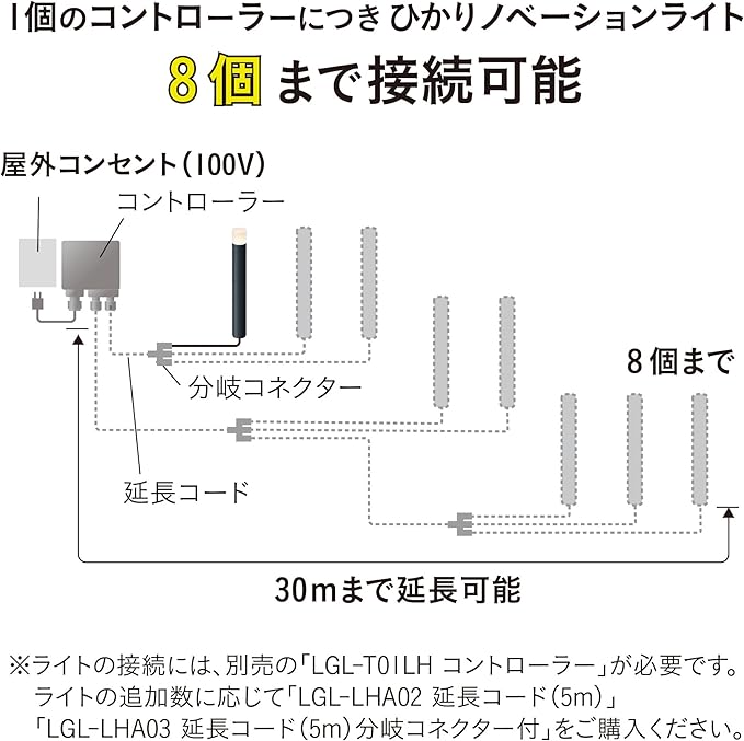 ひかりノベーションシリーズ専用の追加ライト1本入り。基本セットに付属または別売のコントローラーに接続してください。8個まで追加できます。(ライト追加数により、別売の【延長コード(5m)】か【延長コード分岐付】のどちらかをお買い求めください。)
