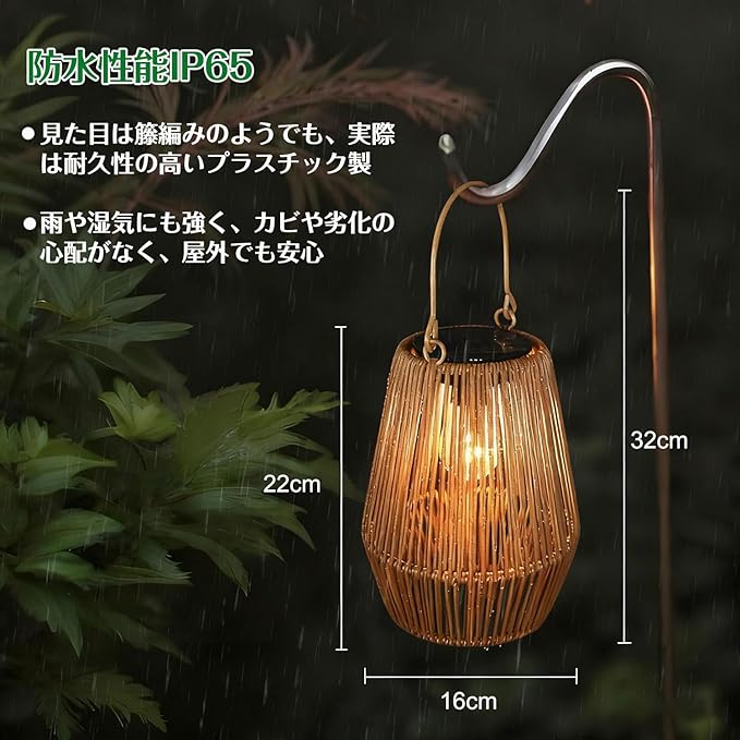 【屋外でも安心の耐候性素材】見た目は籐編みのようでも、実際は耐久性の高いプラスチック製。雨や湿気にも強く、カビや劣化の心配がなく、気軽に屋外で楽しめます。おしゃれさと実用性を兼ね備えたソーラーライトです。