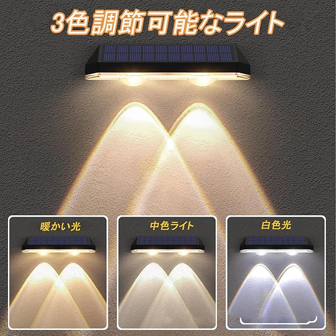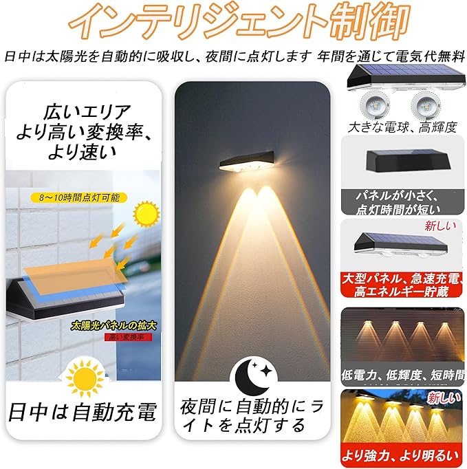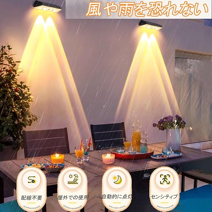 防水設計:ソーラーライト 屋外IP65防水なので、雨天でも心配ありません。雨、雪、極端な気温など、さまざまな屋外環境に耐えることができます。木製のフェンス、デッキ、収納バッグ、別荘、ペダル、フェンス、道端、壁、バルコニー、ガレージのドア、中庭の階段、その他の屋外防水ソーラーライトに適用できます。